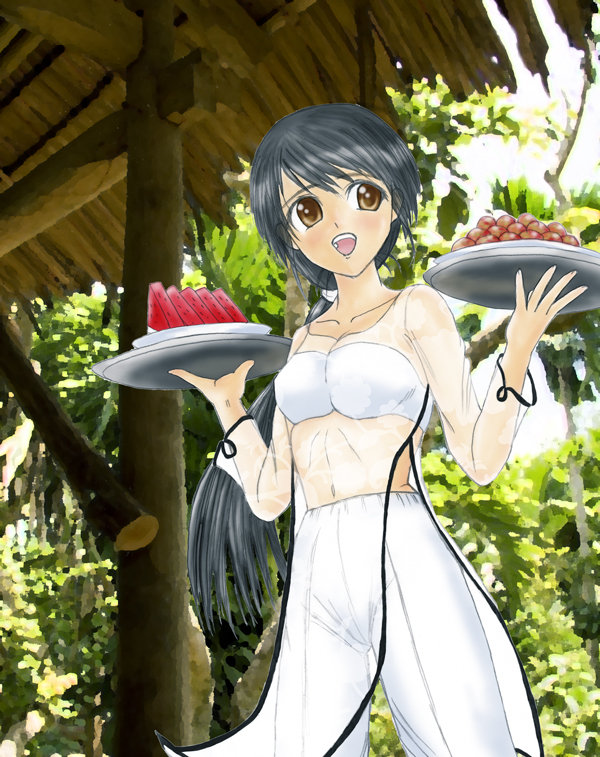 両手の盆いっぱいに南国のフルーツを乗せて、
